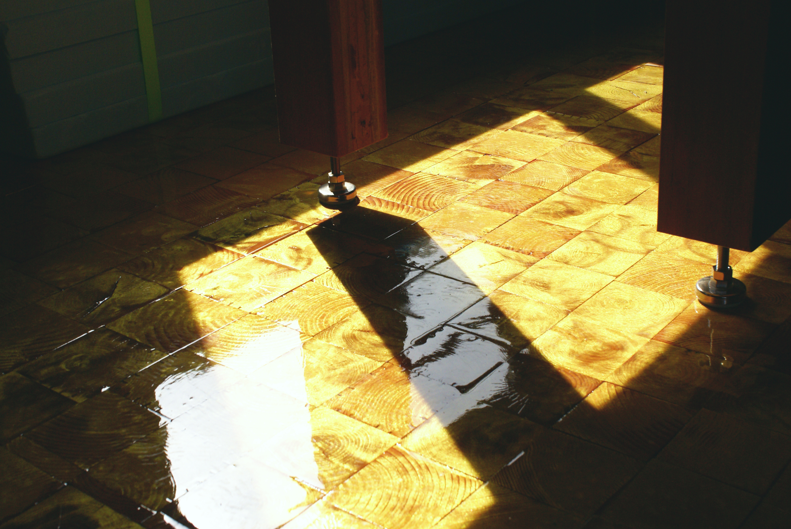 2階共有スペースのダイニングの床。撤去した既存の柱をスライスして、ワークショップで参加者と一緒に敷き詰めた。