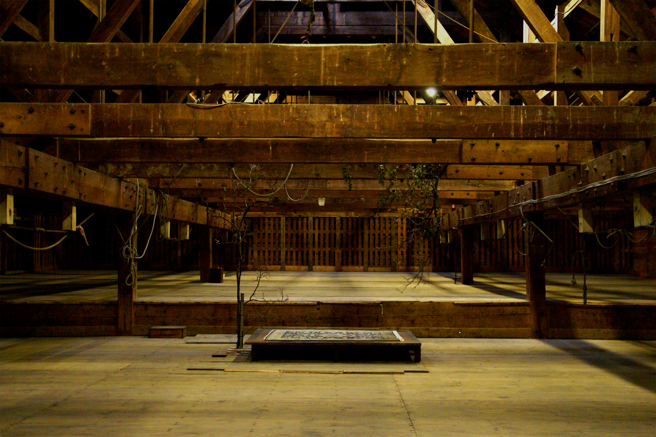 がっしりと組まれた屋根が低く、ステージのようにも見えるどこか神々しい空間が広がる。