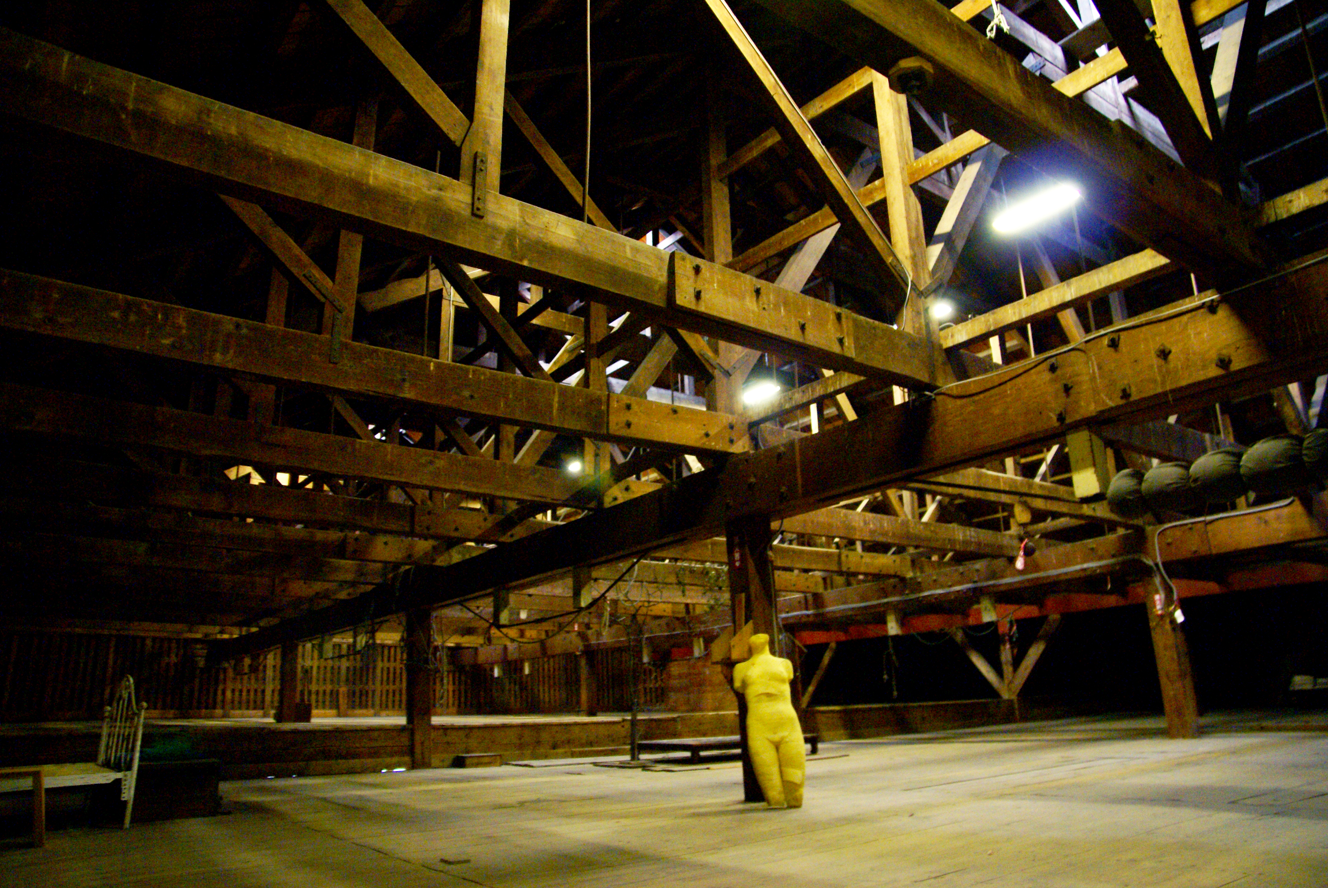 屋根の木組みは、船の底の組み方のよう。照明が最低限しかなく、空間にマッチしている。