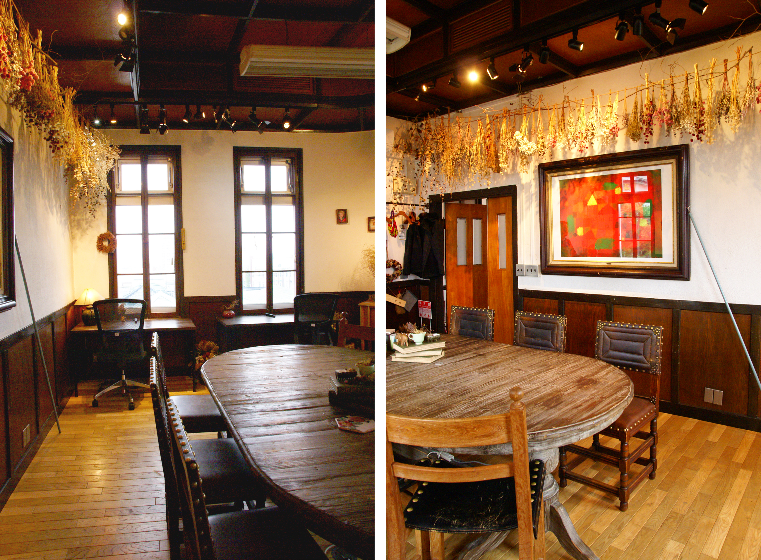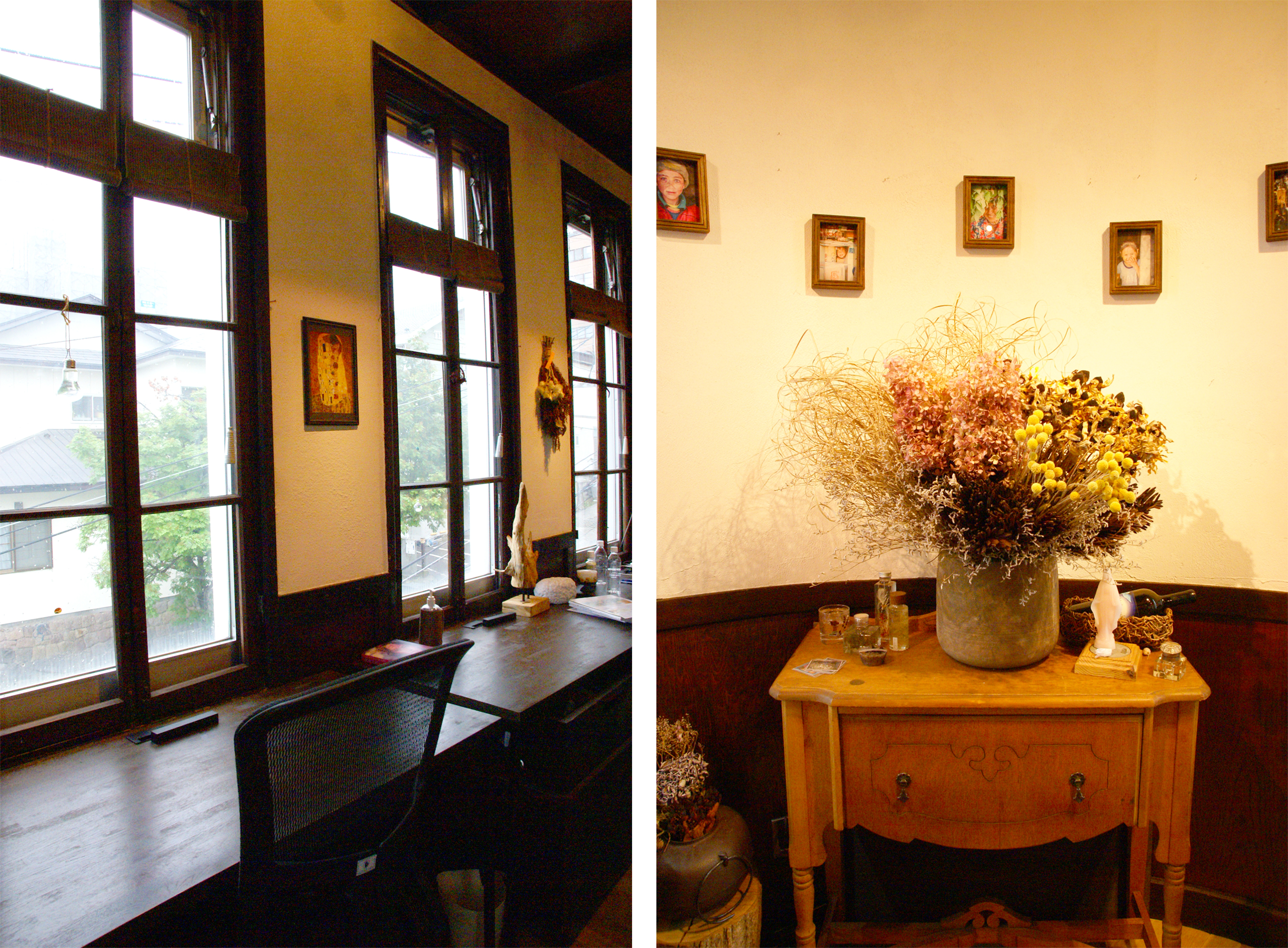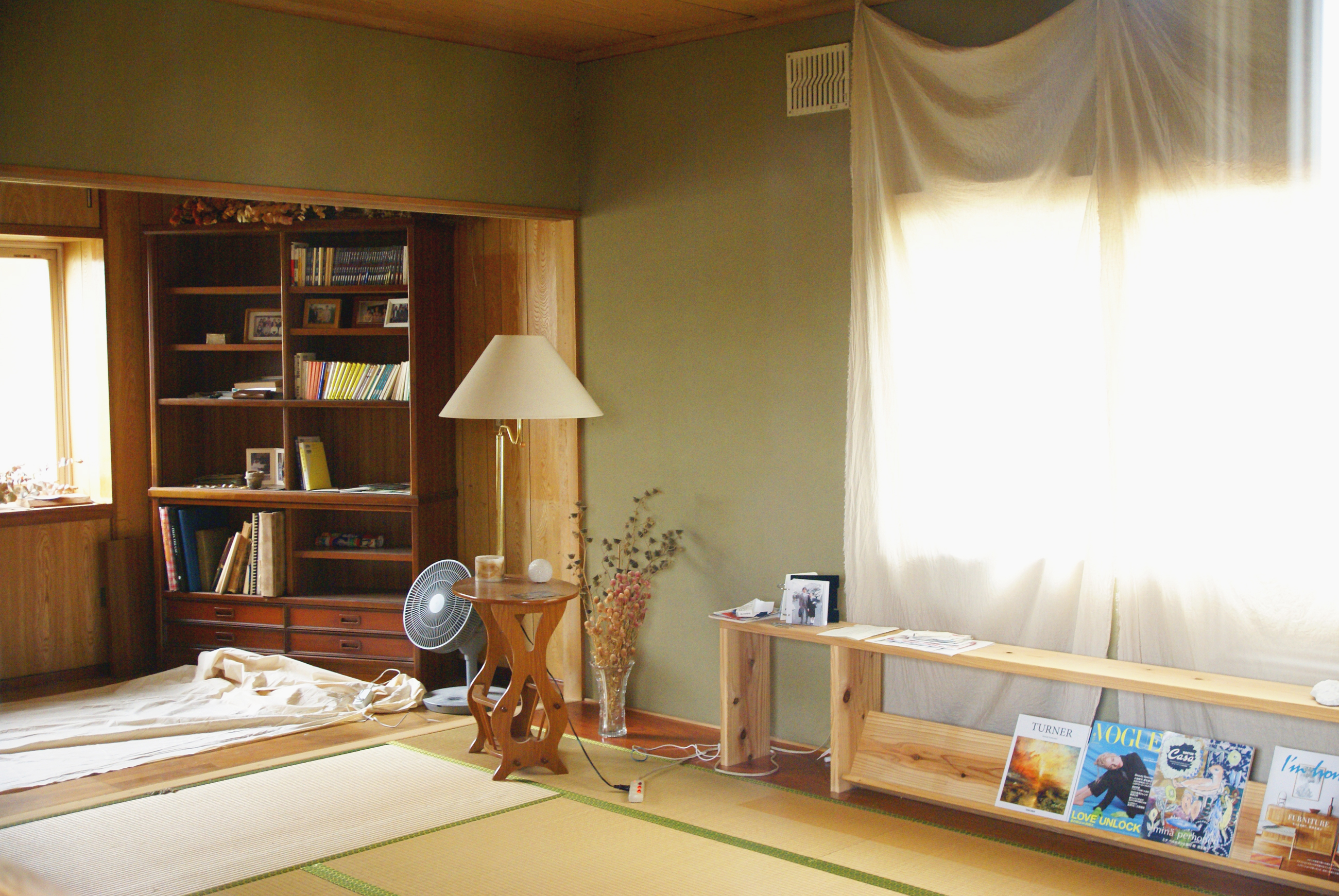 ご自宅の1階。写真右:部屋奥から玄関のほうを見たようす。大きな机があるのは仕事場。この机も元からあったもの。