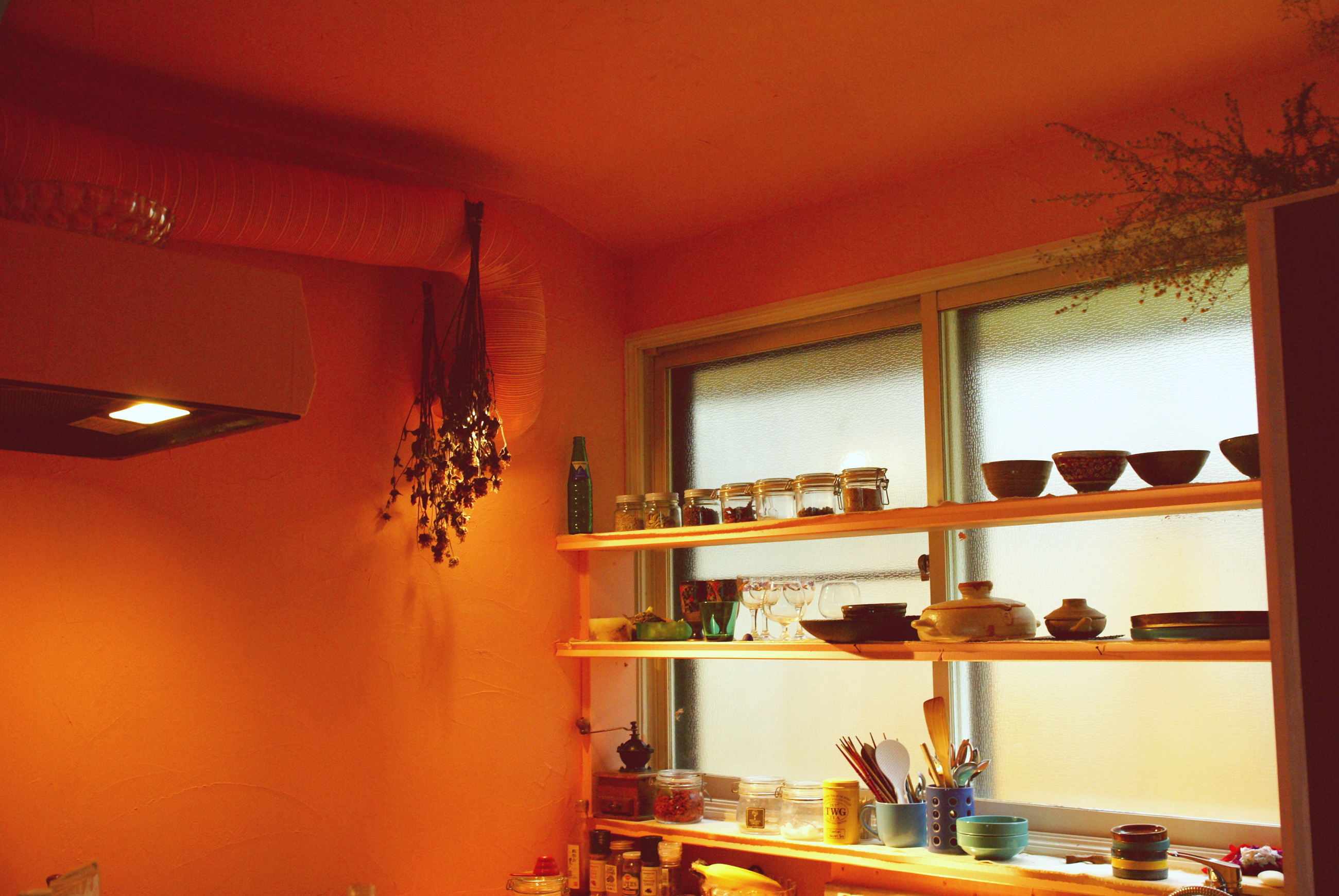 キッチン内天井、壁、ダクトパイプに至るまで同じピンク色で塗装。不思議と気分がやわらぐ色合い。