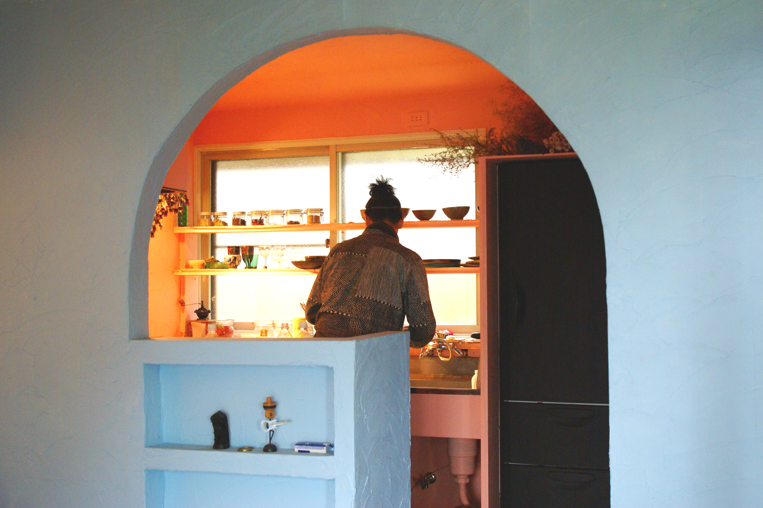 金谷さん「今までの仕事では漆喰などの白い壁に白木の床とか、既製品は使わないようにして自然素材を使っていたんだけれども、この自宅では同じようにやったらおもしろくないなと思って。自分は自分なりの違うものをと思った時に、ここでは自然素材じゃなくて色で自然を感じられるようにしてみようと思ったんです。キッチンをピンクにしたんですが、ピンク色でもいろんな色があるなかで、実際の空と合わせてこの色がいい、と決めていって。」