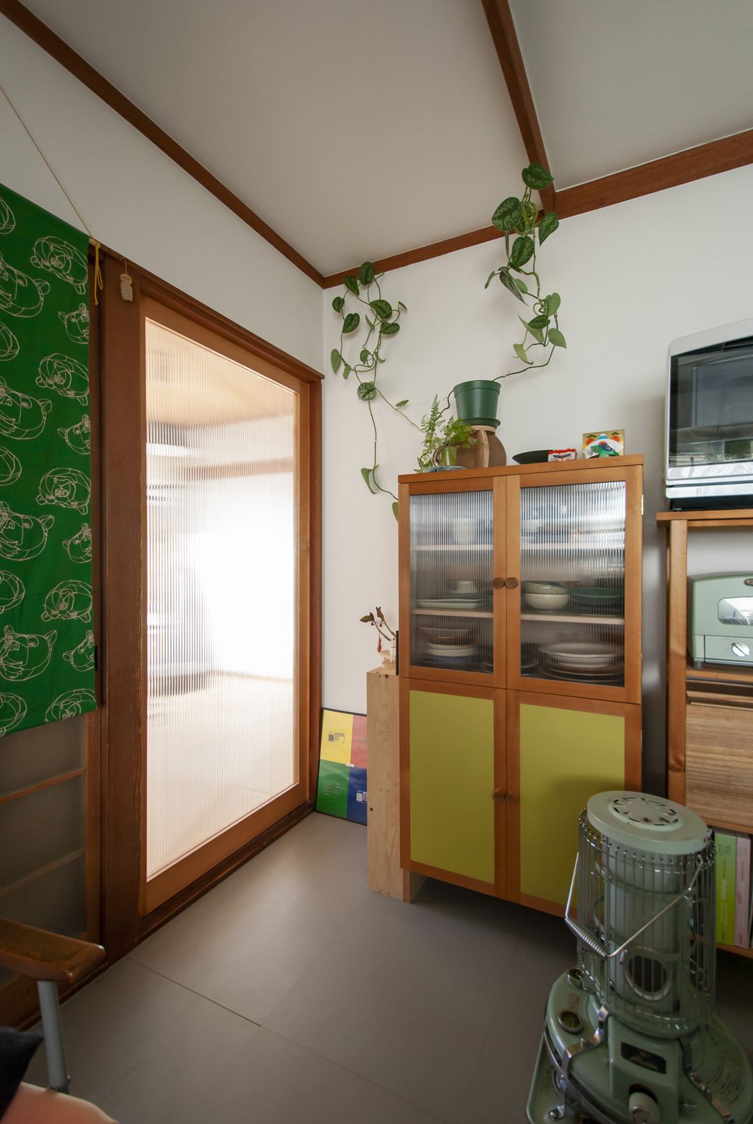 寝室とダイニングを隔てる引戸も自らデザインして製作したもの。基本的に建具は全て変更している。黄緑色の扉がある棚も重名さんデザイン。(提供:studio juna)