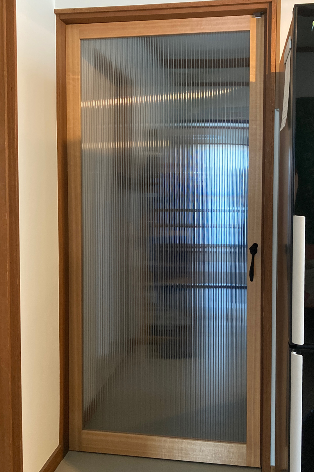 近所の建具屋さんにつくってもらった玄関から続く廊下とダイニングを隔てる建具(扉)