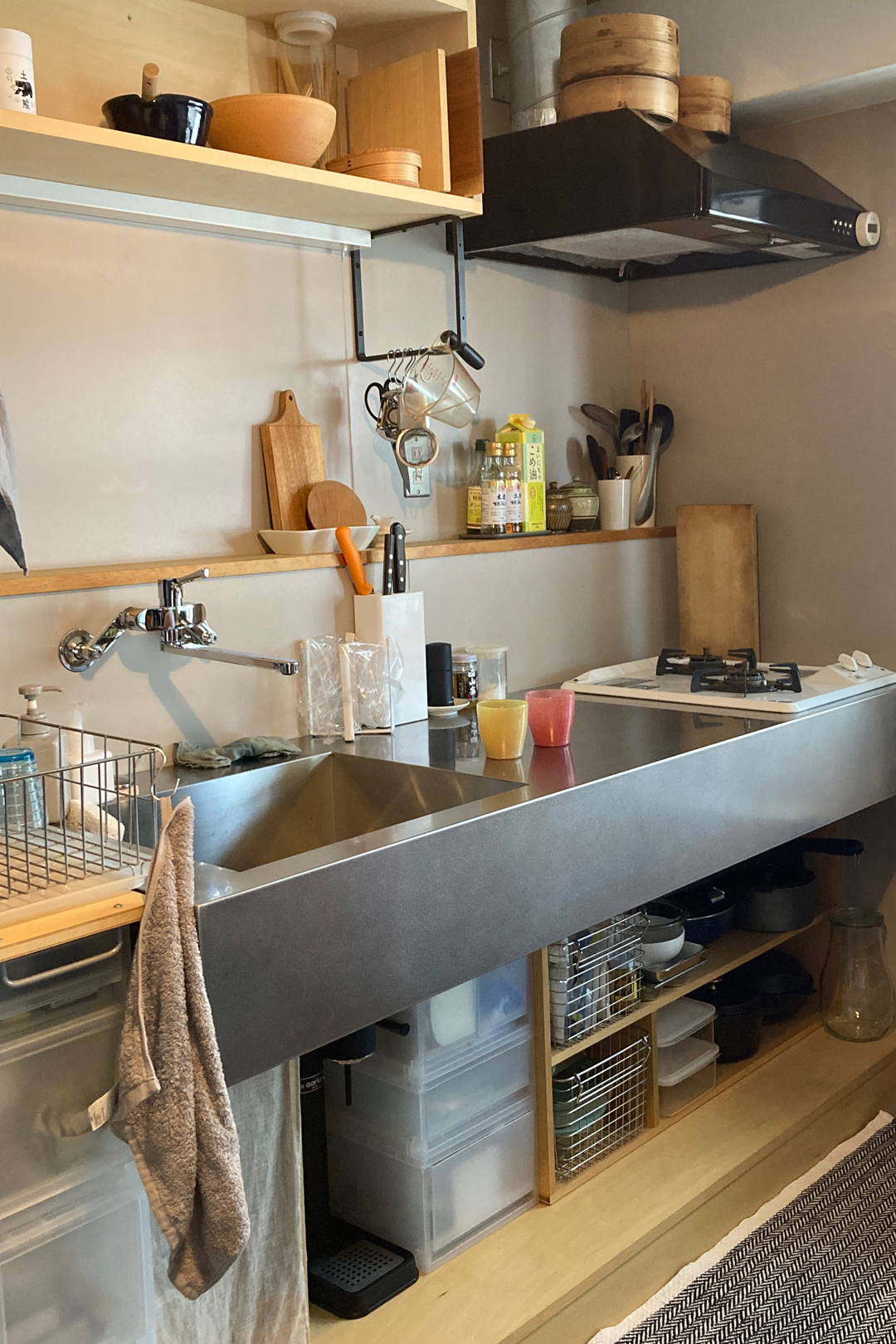 交換したキッチン。古いアパートでもスタイリッシュなステンレスのキッチンがよく似合っている