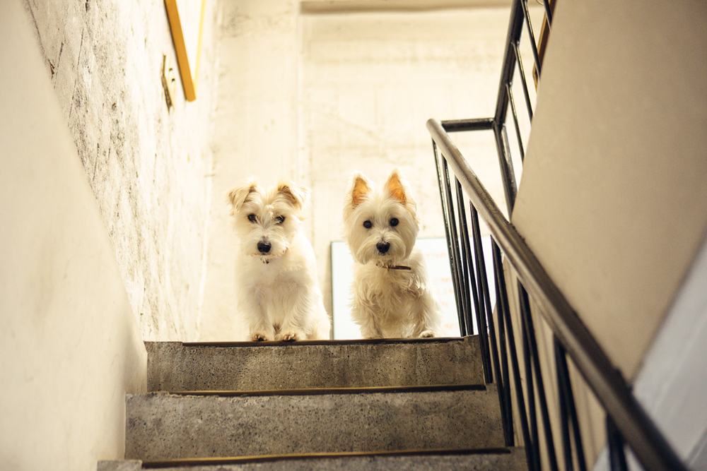 ふと視線を感じて見上げた階段の先、2階フロアから興味津々といった顔でこちらを覗いていたのは、内田さんとスタッフの上田さんの愛犬2匹。