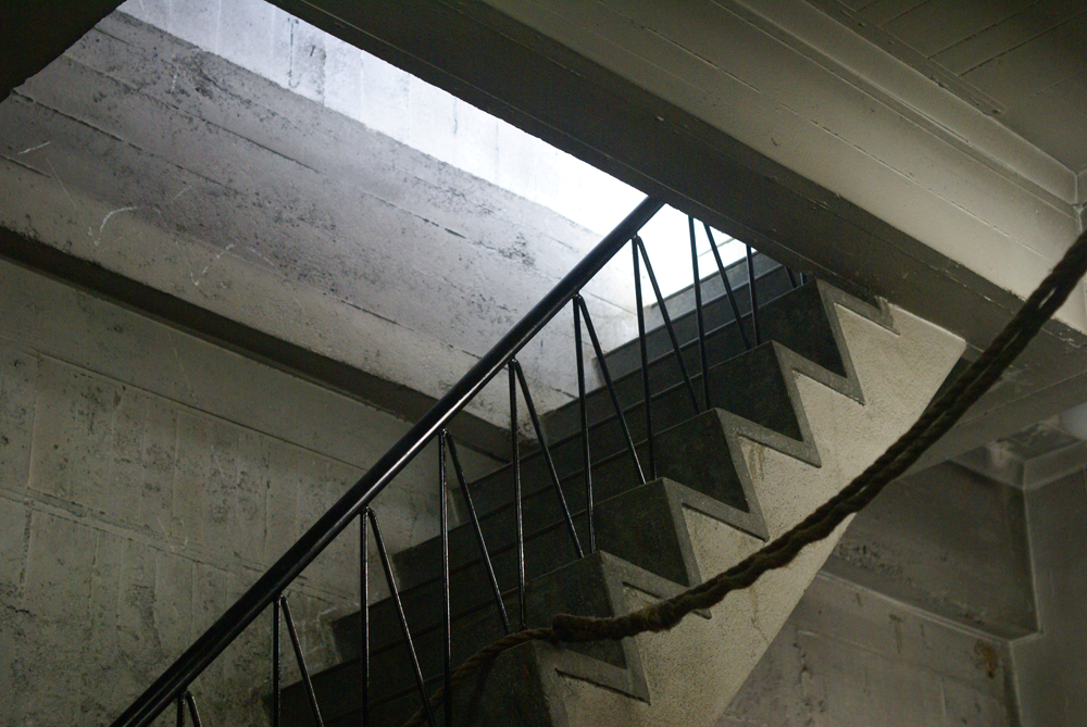 階下に降り注ぐ光に打ちっぱなしコンクリートの外壁が照らされた陰影が美しい