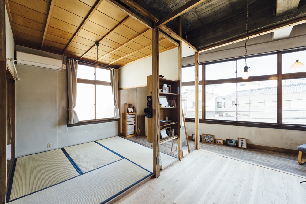 2階の内装は一部木造であったのだろう、既存の間仕切りの柱などで残したいものは残した新旧融合の空間に。
