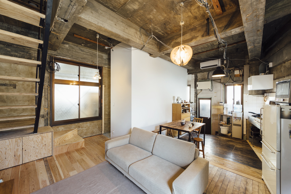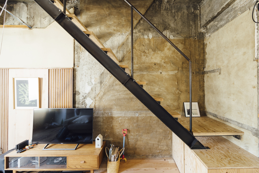 1階住居のリビング。住居スペース内での縦移動ができるよう、階段はリノベーション時に新しく作ったもの。